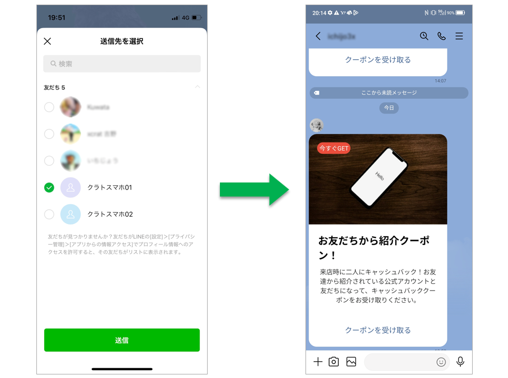 L-BOOSTでは、”送りたいメッセージ”をクーポンとうい形にして、公式アカウントの友だち(既存顧客)から、まだ友だちになっていない潜在顧客へ送信しています。それが「友だち紹介クーポン」です。紹介者と紹介された友だちの両名にクーポンが発行されます。「友だち利用クーポン」はさらに進んで、紹介された友だちが実際にクーポンを利用した時に紹介者にクーポンが発行されます。LINE上のつながりを、オフライン(店舗)へつなげることが可能です。